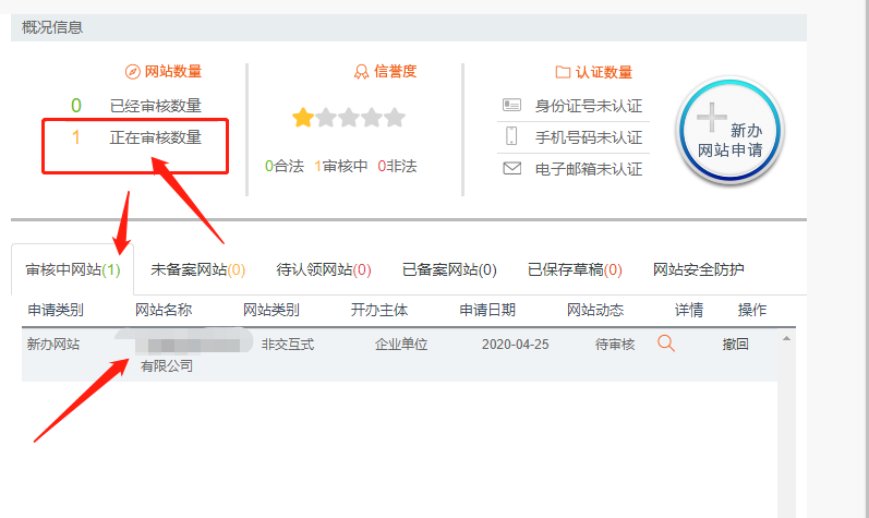 提交成功以后,則會(huì)顯示審核中網(wǎng)站為1
