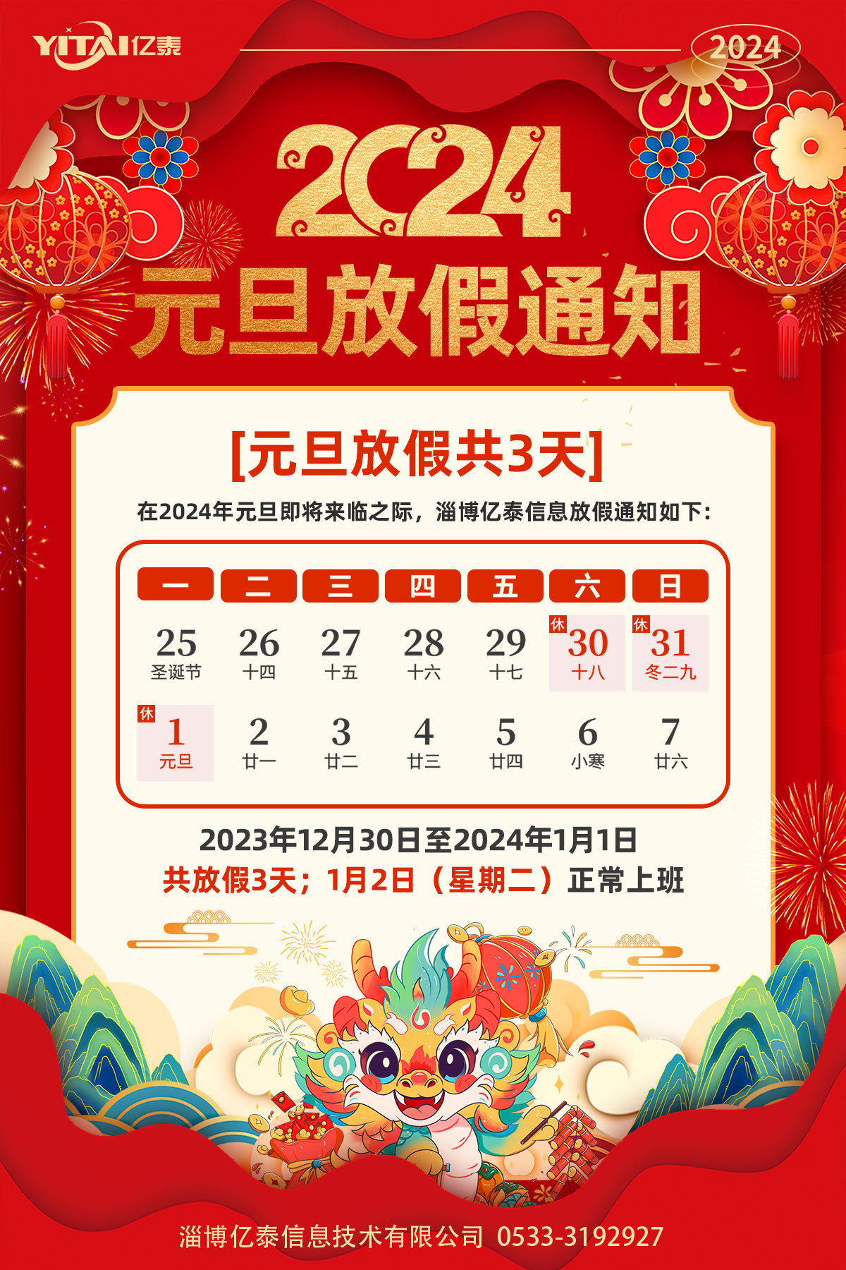 一、放假時(shí)間:2023年12 月30 日 (星期六) 至 2024年 1月1 日 (星期一)3 天。2024年1月2日(星期二)上班。